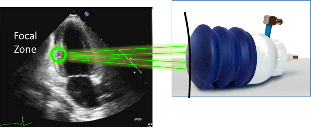 The treatment is performed using a shock wave generator that is designed to address the unique clinical-anatomical requirements of the chest cavity. A cardiac ultrasound imaging system is used to locate the treatment area and to map the exact position and extent of the ischemic zone. Shock waves are then delivered via the anatomicalacoustic window to the treatment area under E.C.G. R-wave gating. Several treatment sessions are required to obtain optimal results.